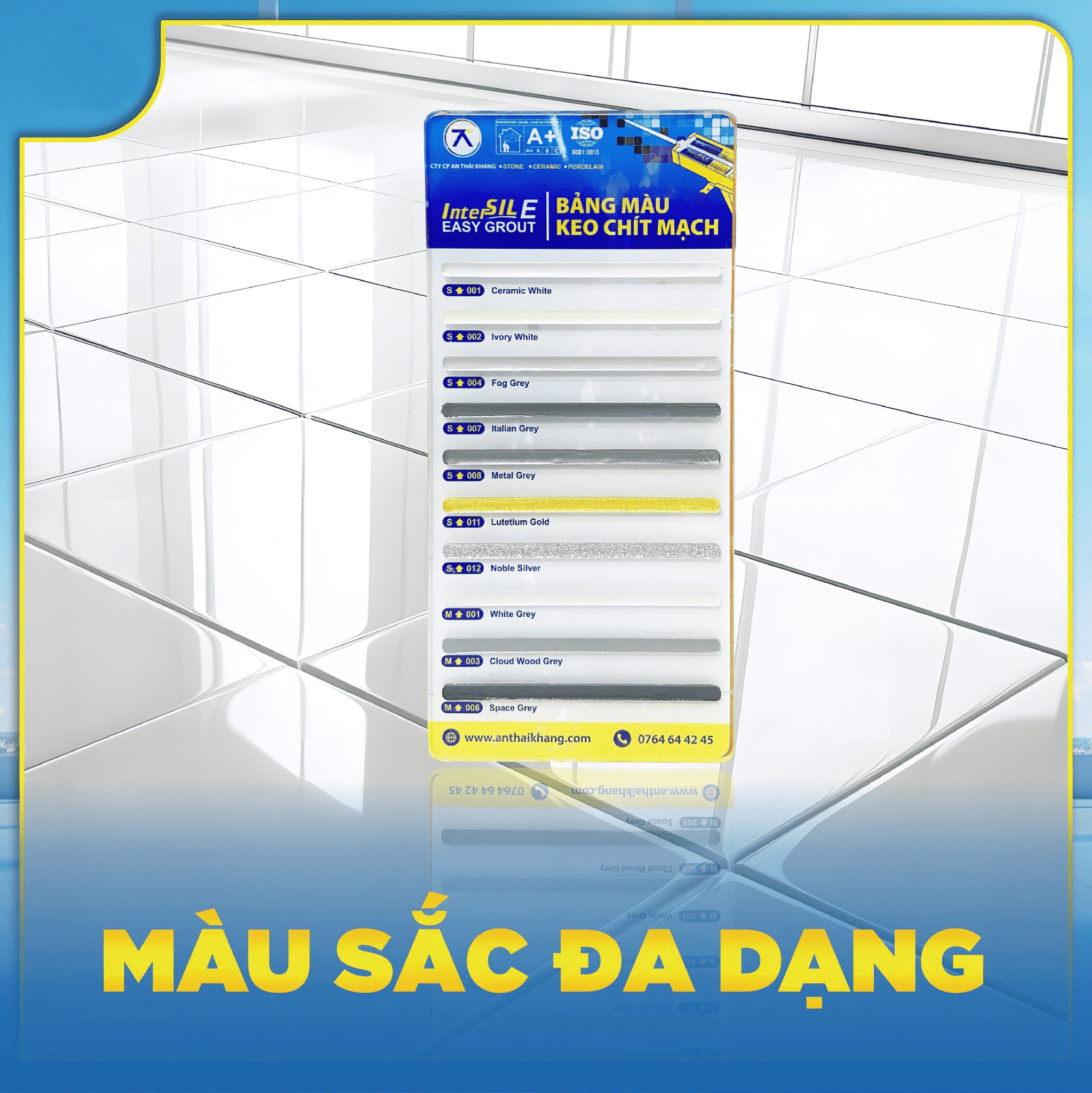 Keo chít mạch SIL E có màu sắc đa dạng, phù hợp với nhiều loại gạch và phong cách trang trí. Từ những tông màu trung tính như trắng, xám, đến những màu sắc nổi bật như vàng, xanh, tất cả đều giúp không gian trở nên tinh tế và đồng nhất.